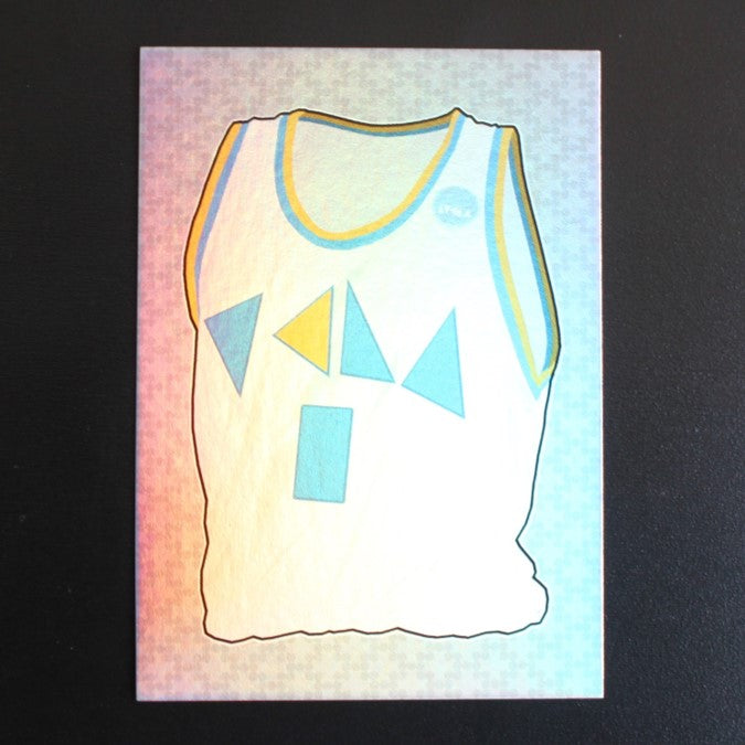 Card number 17 of a 27 card set celebrating the storied histories of legendary programs. Featuring bold, eye-catching colors and a brilliant holographic finish that refracts light beautifully off the silver backdrop. Back of card features all three designs for each program, and unique patterns in each program's colors. Limited to 9 signed and numbered prints.
